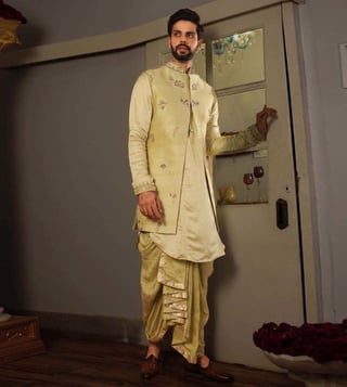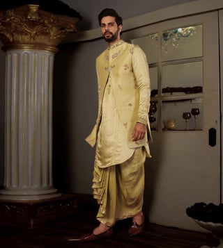 Get a statement look with this silk bandi set from the Rameo collection. Hand-embroidered motifs, beautiful detailing and sharp silhouette makes for a regal sartorial quotient. Disclaimer: Product colour may slightly vary due to photographic lighting sources. Country Of Origin - India.