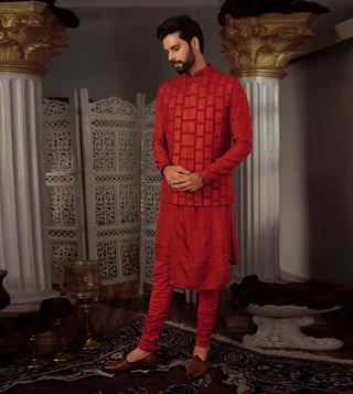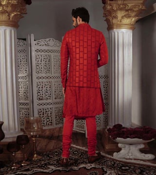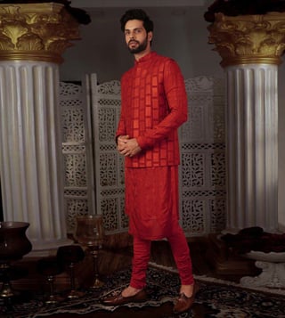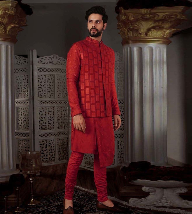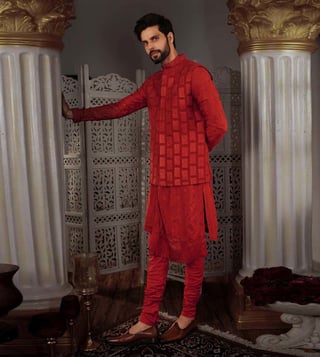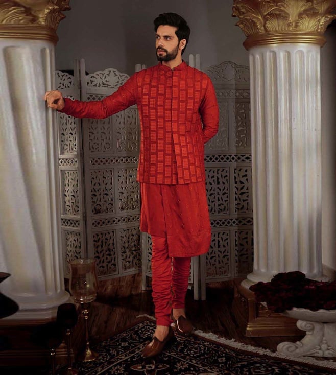 Made luxuriously and with rich detailing, this bandi set from the Rameo collection is an easy choice for any formal occasion. Tailored to perfection, the kurta and bandi are crafted using silk while the churidar is made of stretch cotton. Disclaimer: Product colour may slightly vary due to photographic lighting sources. Country Of Origin - India.