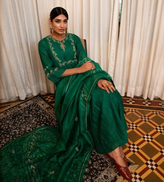 Discover the elegance of Zebein India's Green Chanderi Silk Kurta Pant Set for women, perfect for casual occasions with a stylish regular fit. Disclaimer: All other items in the image are only for display purposes and will not be a part of the delivery content. Product colour may slightly vary due to photographic lighting sources. Country of Origin - India.