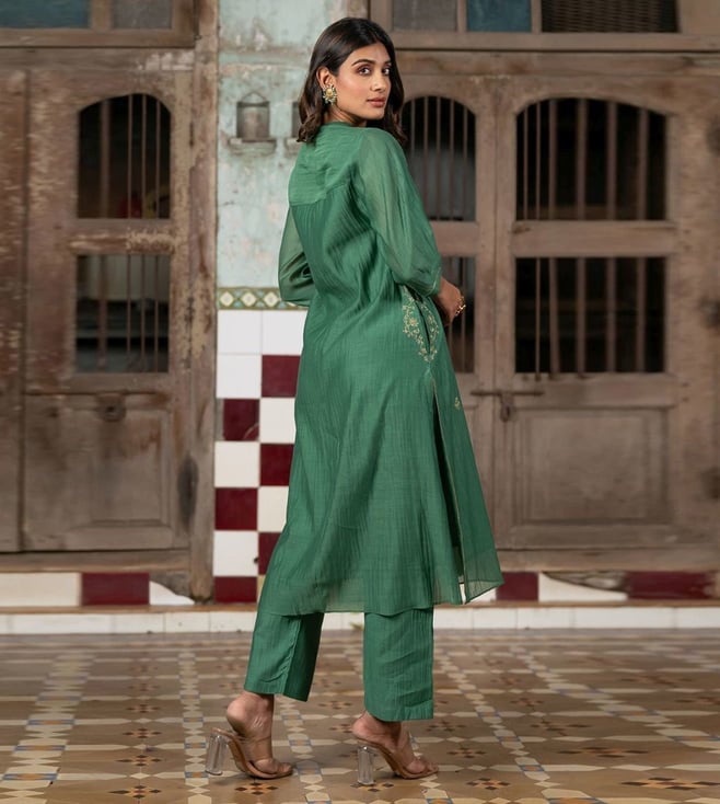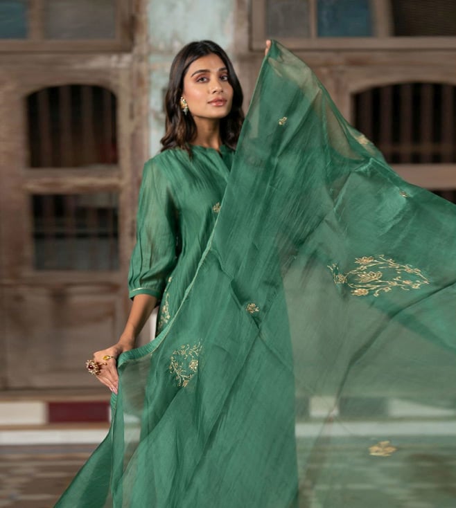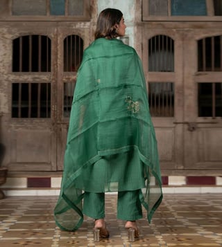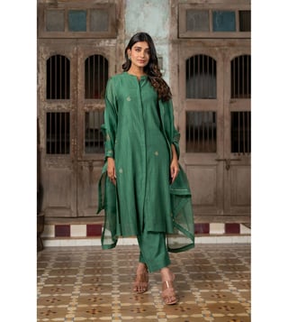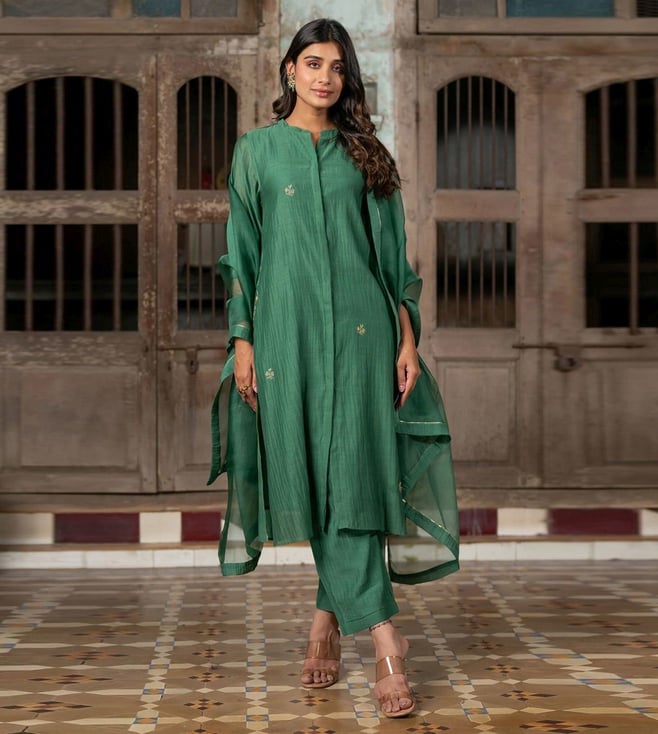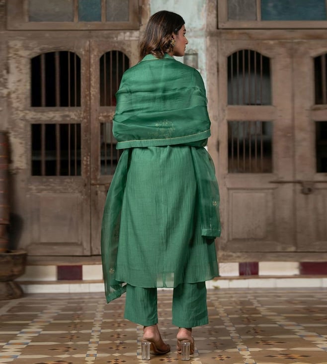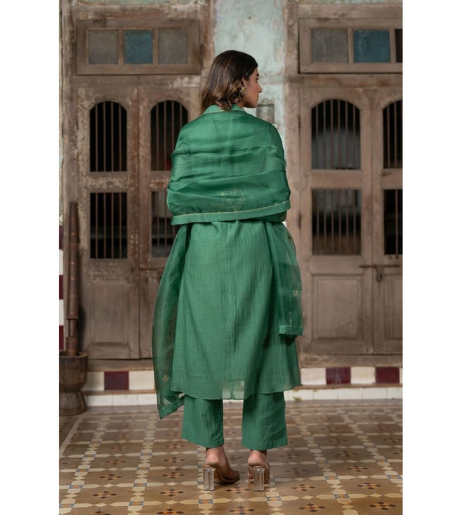 Green Dastak Roshan Chanderi Silk Button Kurta with Pants and Dupatta