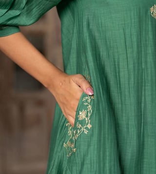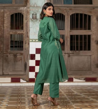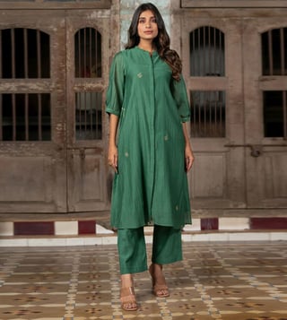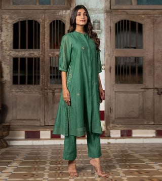 Polish your ethnic look by wearing this kurta set from the Dastak collection. It is made of chanderi silk, silk organza and is lined with mul cotton. It is embellished with intricate embroidery motifs that gracefully dance across the ensemble, seamlessly embracing even the pockets. Disclaimer: Product colour may slightly vary due to photographic lighting sources. Country of Origin - India.
