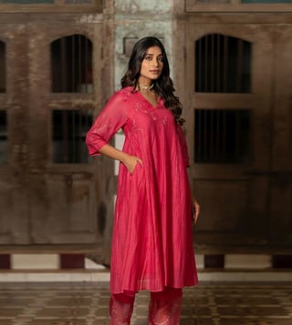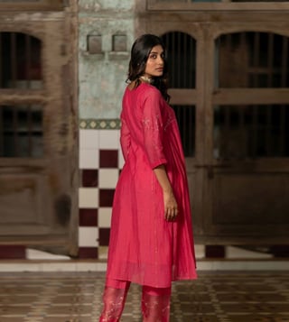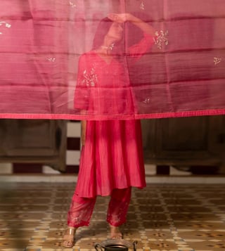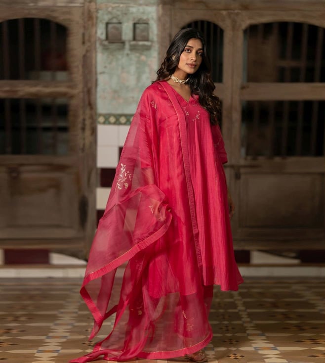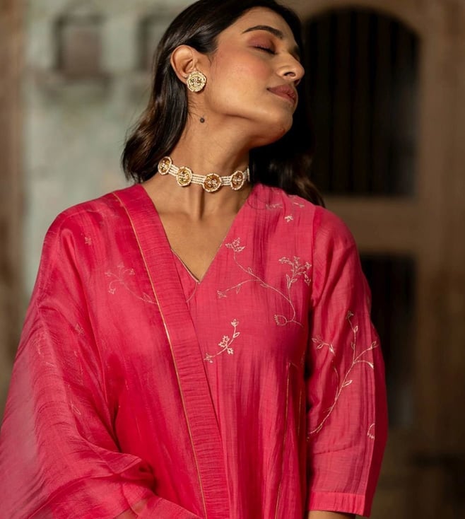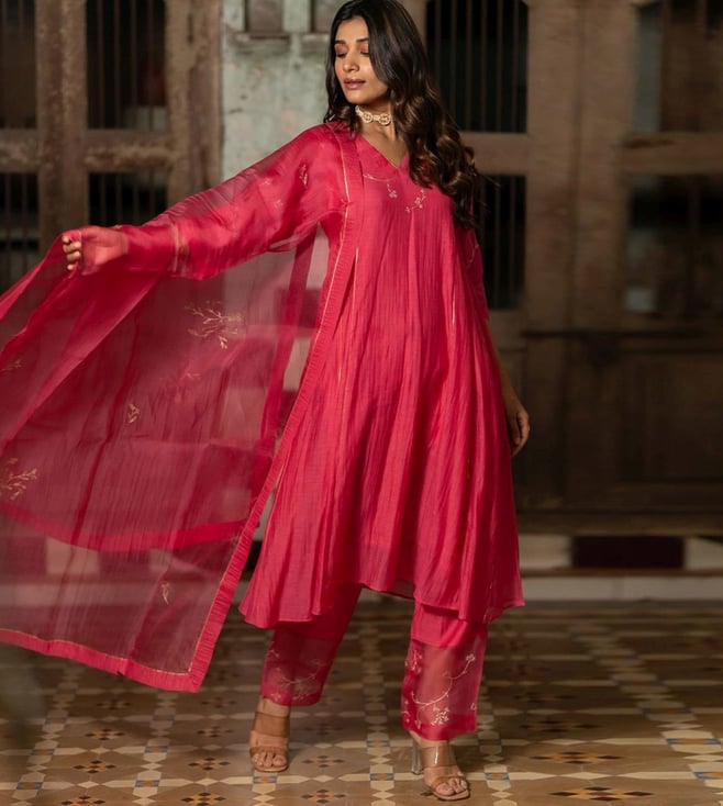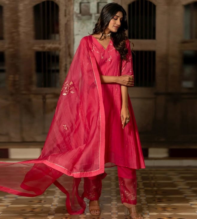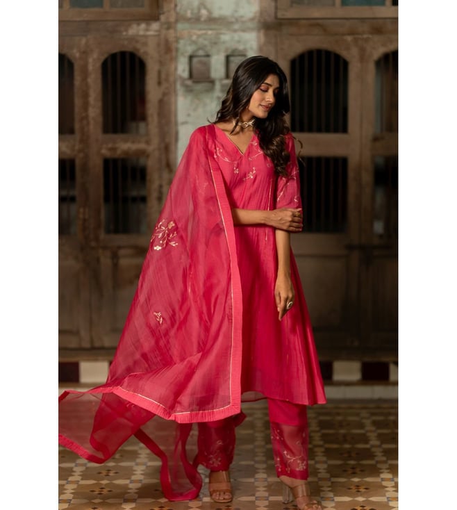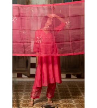 Zebein India Pink Dastak Phool Jhali Chanderi Silk Side Kali Kurta with Pants and Dupatta
