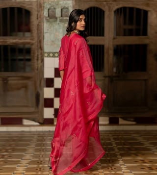 Polish your ethnic look by wearing this kurta set from the Dastak collection. It is made of chanderi silk, silk organza and is lined with mul cotton. Crafted with precision, this ensemble showcases the artistry of intricate zari hand embroidery using the revered aari embroidery technique Moreover, the inclusion of pockets in the kurta and pants not only adds a touch of practicality but also liberates you from the worry of carrying your essentials by hand during festivities. Disclaimer: Product colour may slightly vary due to photographic lighting sources. Country of Origin - India.