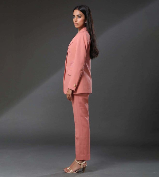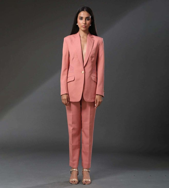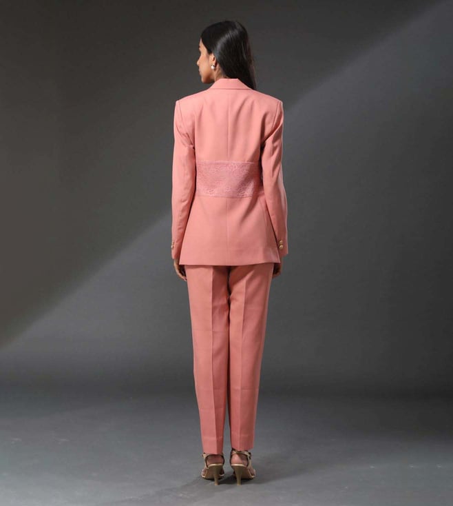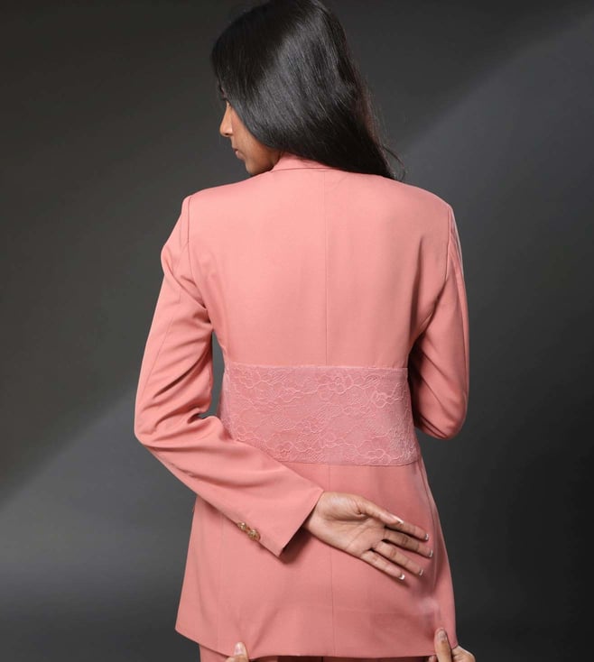 This tailored blazer gives a shape to the waistline by bringing the focus to the intricate floral lace detailing on the waist. The floral embellished button fastening allows one to let the blazer loose or fasten the waist button to flaunt the figure. This ultra-feminine and classic blazer have peak lapels. The flap pockets in the front make the blazer quite functional and stylish. Disclaimer: All other items in the image are only for display purposes and will not be a part of the delivery content. Product colour may slightly vary due to photographic lighting sources. Country Of Origin - India.
