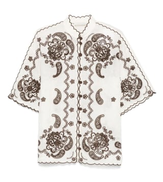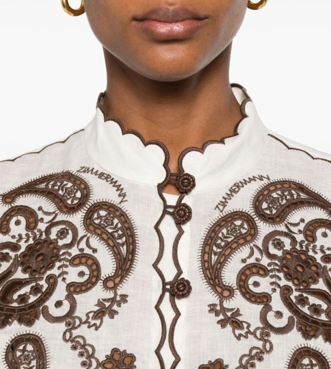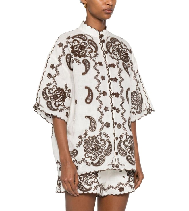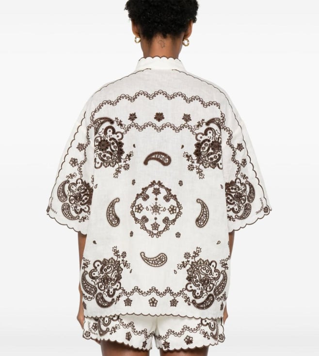 Embrace effortless elegance with this casual beige shirt, adorned in a timeless paisley pattern. Crafted from a luxurious blend of 100% linen/flax and 100% polyester, it offers a soft, breathable feel perfect for any season. The short sleeves and mandarin collar add a touch of modern sophistication, while the sleek closure ensures a flattering fit. Designed for the contemporary woman, this shirt effortlessly transitions from day to night, making it a versatile staple in any wardrobe.