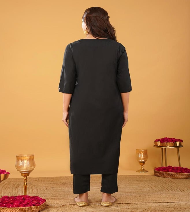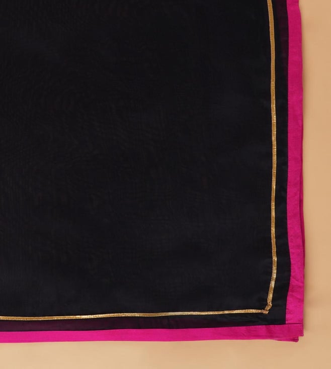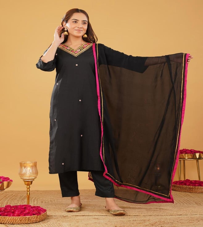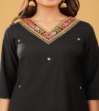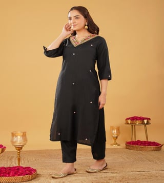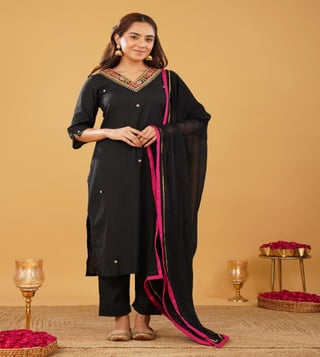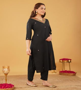 Stunning Black Kurta featuring intricate embroidery all over with Gota Patti work on Neck is perfect for this festive season. Paired with matching pant and dupatta studded with gotta work its just simply unmissable