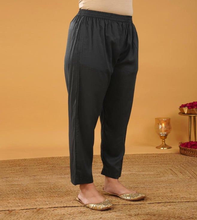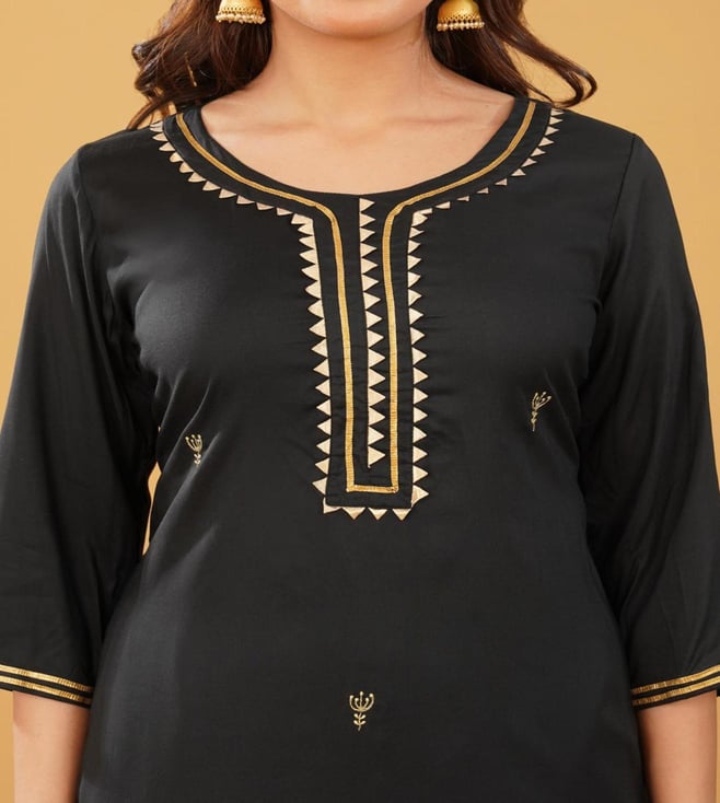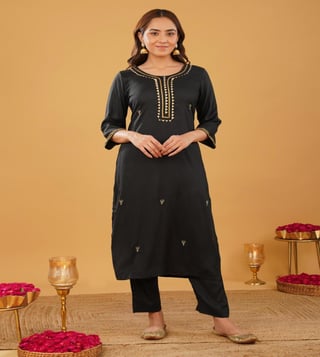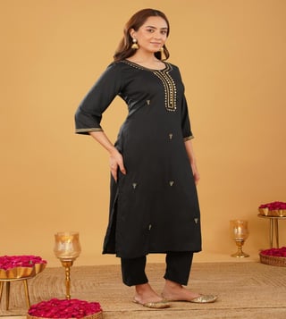 Stunning Black Kurta featuring intricate embroidery all over with Gota Patti work on Neck is perfect for this festive season. Paired with matching pant its just simply unmissable