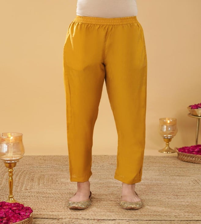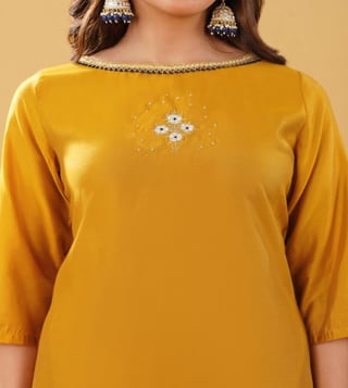 Mustard silk blend kurta with beautiful hand embroidery ethnic motif on the body along with beautiful lace work on th neck is perfect for this festive season. Pair it with matching pant along with matching earrings to close the look.