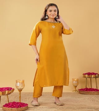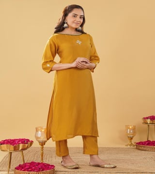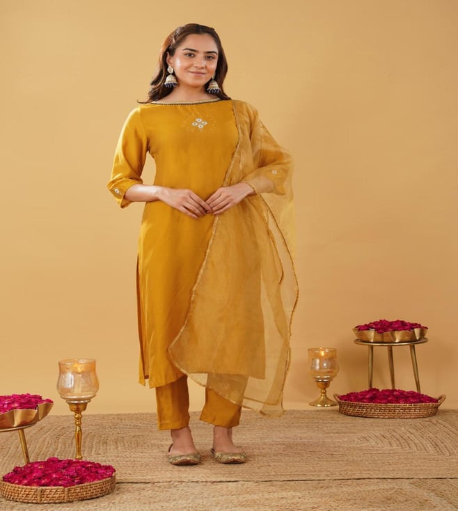 Zuri Mustard Silk Regular Fit Embroidered Suit Set