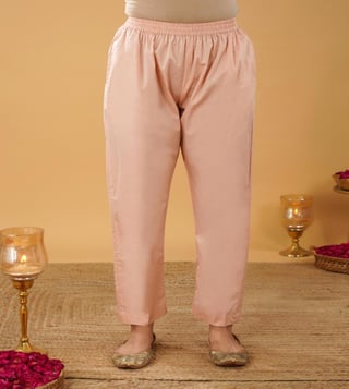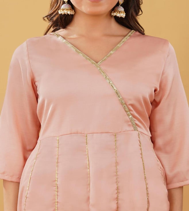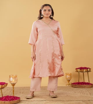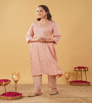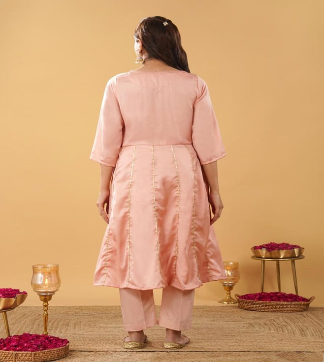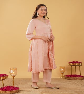 Peach Silk blend Anarkali comes with V neck and 3/4 sleeves. This Anarkali has gota work detailing and is perfect fit for the the festivities. Comes with matching pant.