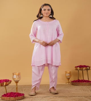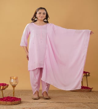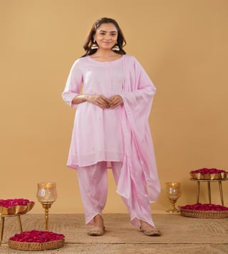 Stunning Pink Kurti with patch work embroidery comes with 3/4 sleeve and round neck with laces on kurta patti. Pair it with lace work tulip pant and matching lace dupatta.