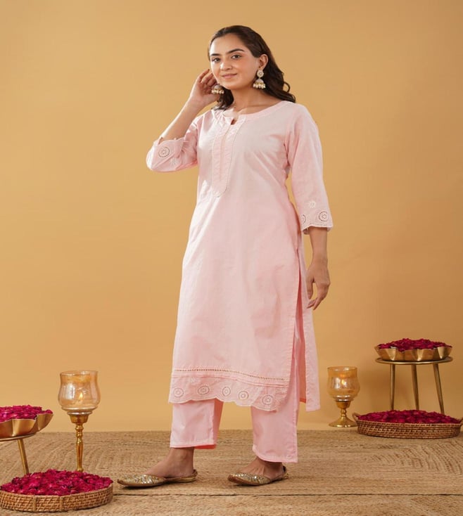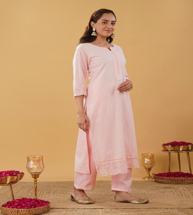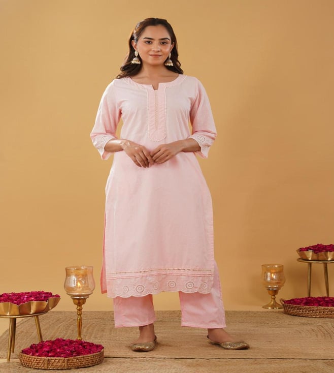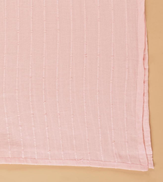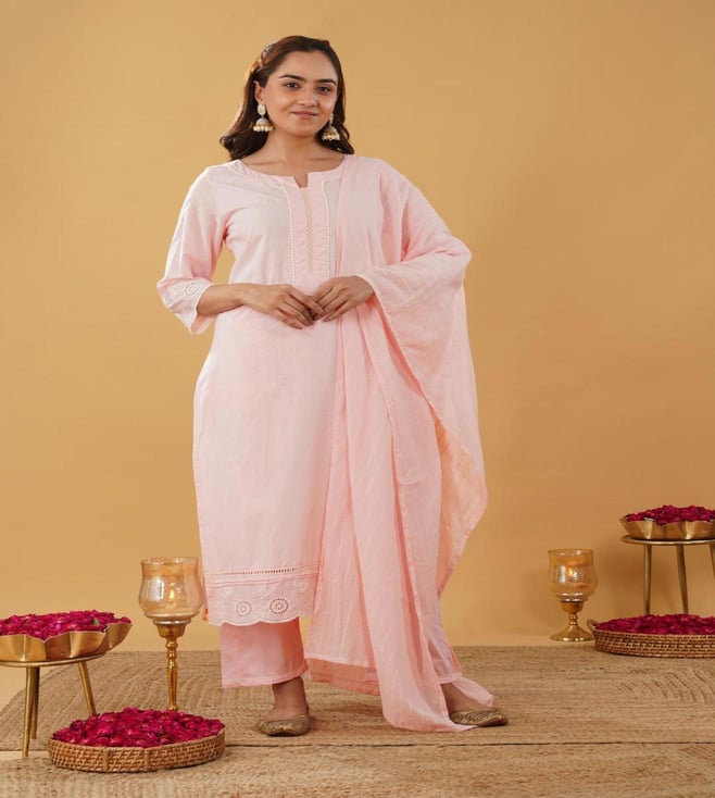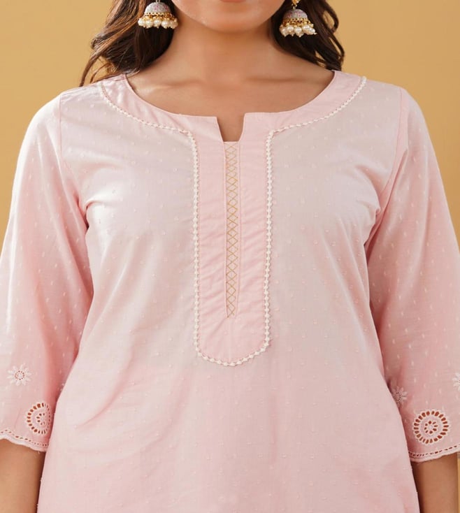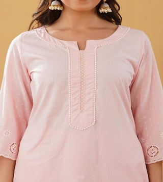 Effortlessly charming Pink Dobby Kurta set with beautifully crafted scalping on hem and sleeves with a dash of zari work on the yoke to highlight the design. This evergreen set is the right choice for the festive season and you can trust all the appreciation coming your way. Comes with a matching pant along with self work Dupatta. Pair it up with pearl set and sandals to complete the look.