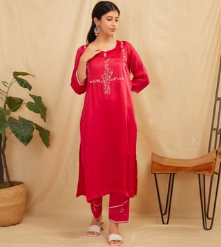 Make a distinct appearance by wearing this kurta with pants from the Zareen collection. It is tailored to perfection using satin silk. The kurta has a lace detailing and comes with a cotton lining. The pants come with pintuck and hand embroidery on the hem with lace detailing, an elasticated waist and a drawstring for fit. Disclaimer: Product colour may slightly vary due to photographic lighting sources. Country of Origin - India.